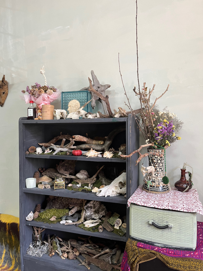 — Матеріали самі мене знаходять, — каже дівчина. — Бачу шматок гарної коряги або квіточку, забираю, висушую, і колись вона точно стане частиною роботи. А поки — просто тішить око.