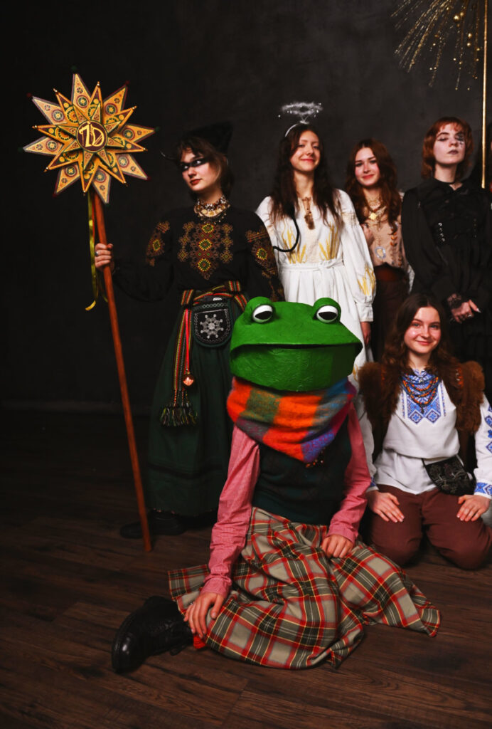 — Вже другий рік з пані Марією, загорілася ідеєю вертепу. Думала про Козу, але вирішила, що Козою буде кожна третя. Тож вибрала Жабу. Склеїла голову з картону. Пофарбувала. Привезла на фотосесію, залишу тут, потім ходитиму в ній із вертепом по Києву. У Двіжі так підібралися люди, що цікаво разом подорожувати, ходити по музеях, співати.