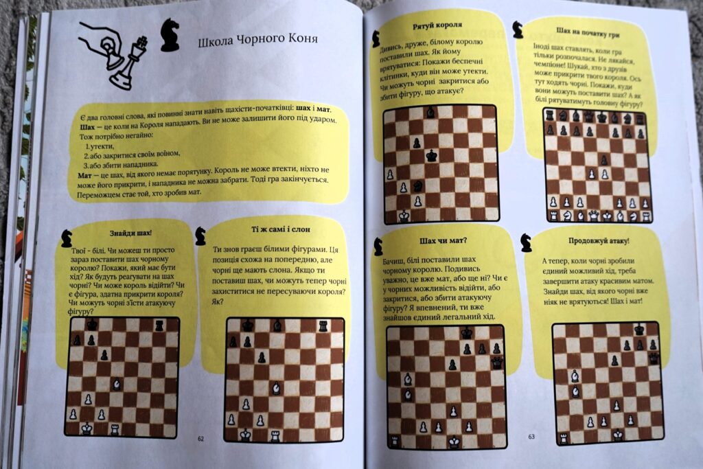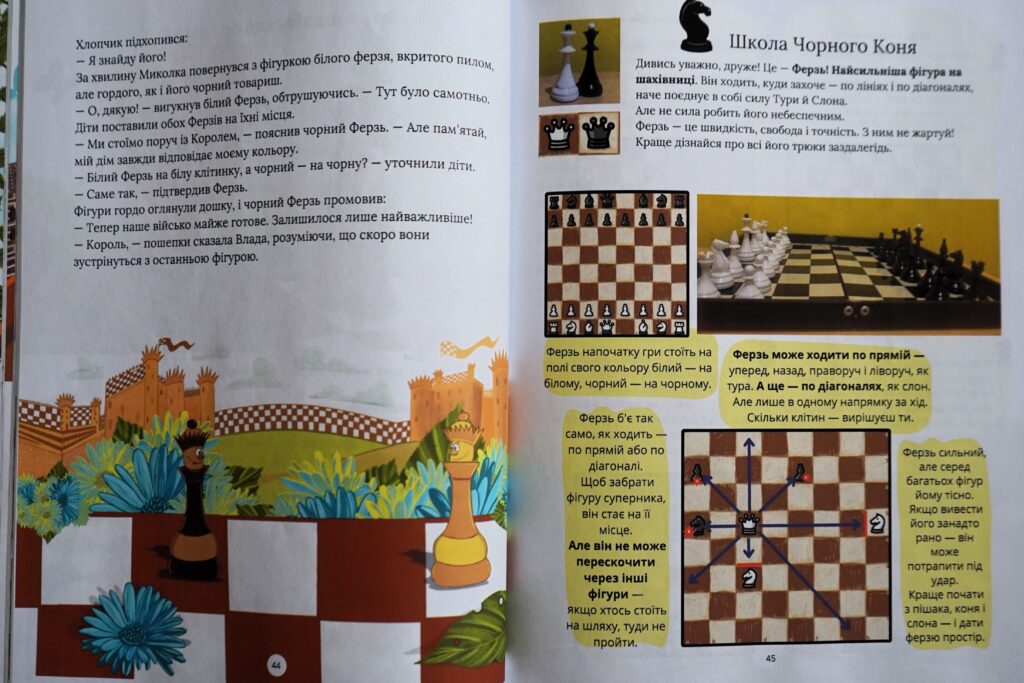 Отже, цей посібник – популяризація шахів серед батьків малечі. Мені хотілося, щоб малеча закохувалася в гру без страху перед складними правилами, тому й народилася «Школа Чорного Коня» — коротенькі доступні уроки із завданнями для закріплення.