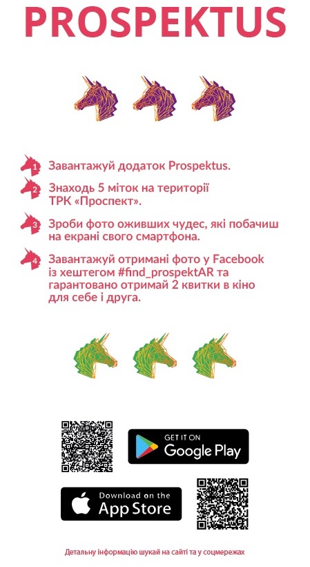 На пространстве торгово-развлекательного комплекса расположены метки «Скануй мене тут» с виртуальными эффектами, благодаря которым можно загрузить на телефон Prospektus.