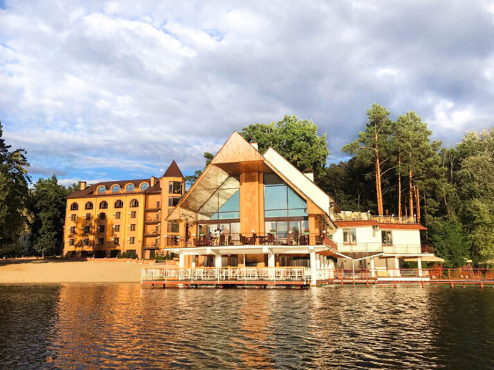 Тут є камінна зала з терасою та панорамним видом на озеро, тераса на понтоні та бесідка, якщо ваша компанія хоче власноруч щось посмажити. Кухня класична, локація перевірена часом, ідеально для сімейних посиденьок та різних святкувань.