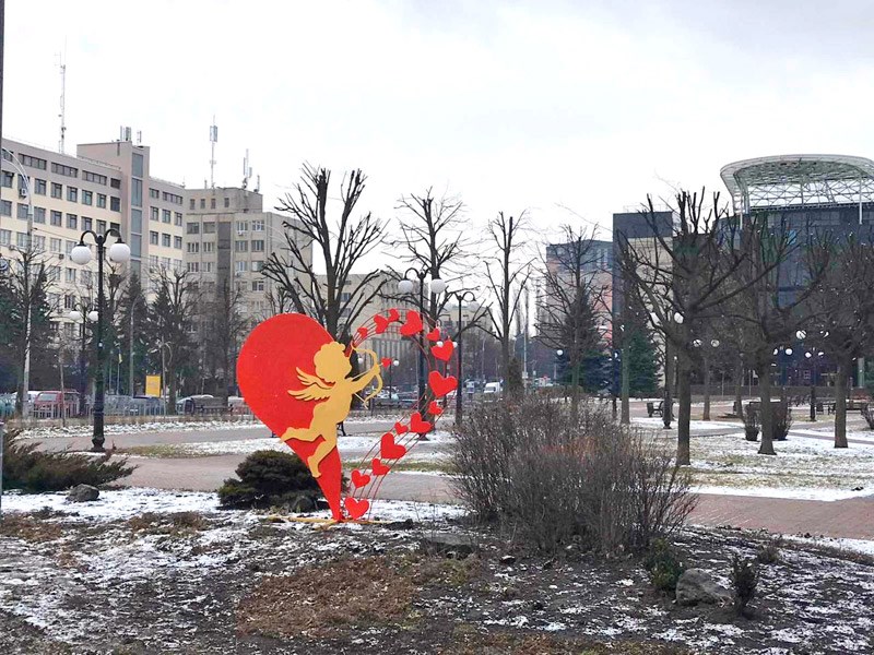 Підказка закоханим: нема сенсу бігти туди просто зараз. На фоні сірої землі та чорних кущів все це виглядає не дуже. Дочекайтеся весни і фотографуйтесь поряд із купідончиком та квітучими клумбами. Зазвичай біля райдержадміністрацій влаштовують дуже яскраві квітники.