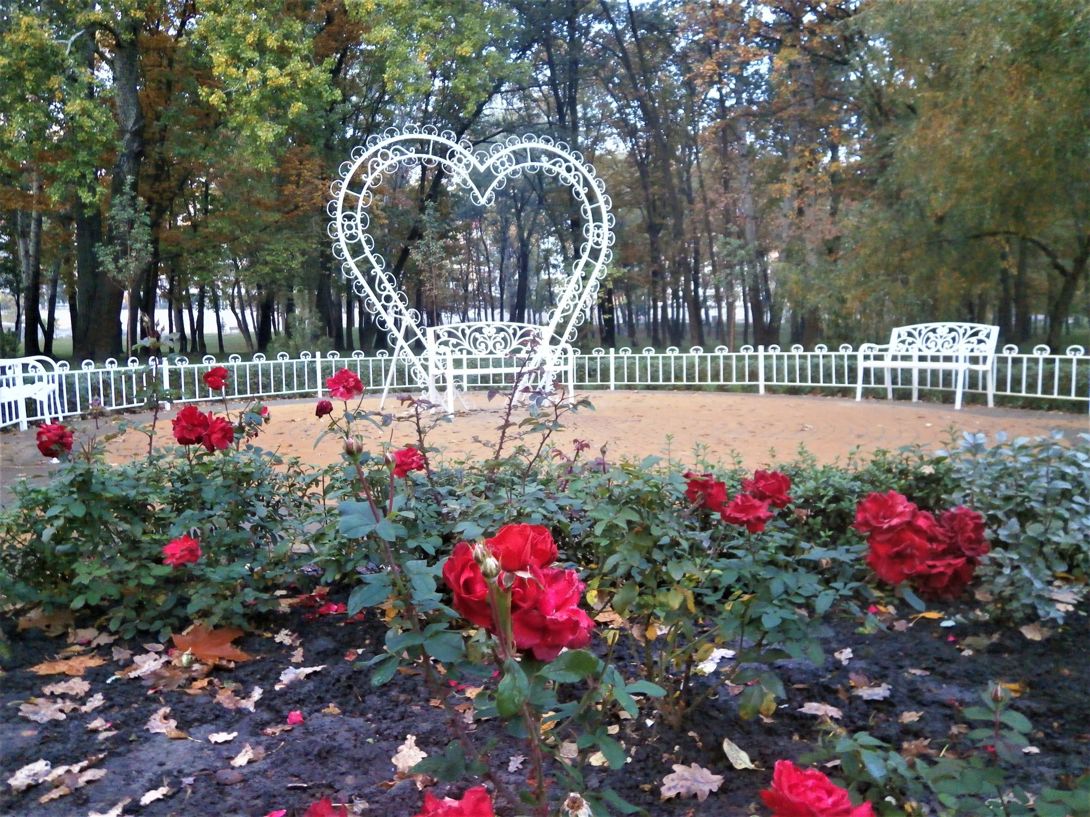 Підказка закоханим: Дочекайтеся, поки у парку розквітнуть червоні троянди: фото у білому ажурному серці на фоні квітів вийде дуже ефектним.