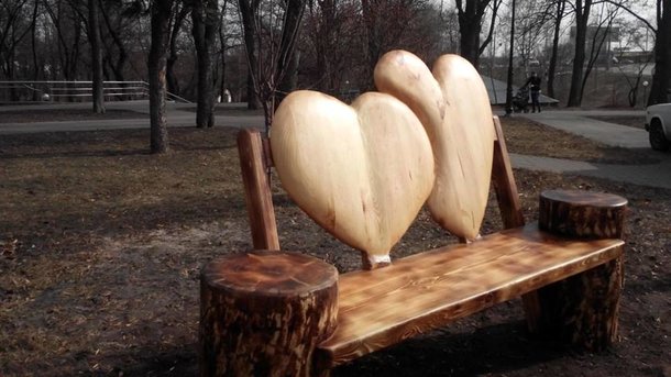 Лава зроблена з дерева, серця на її спинці — також. Може виглядає й не так ефектно, як лавка у ботсаду, але зручніше для довгих посиденьок із душевними розмовами та поцілунками — це точно.