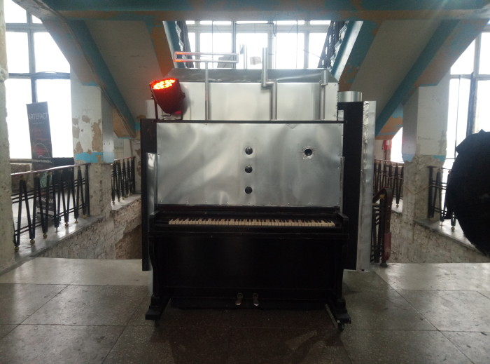 Трансформація музичного інструмента в фотоапарат. Якщо зайти всередину, то можна побачити, як працює камера-обскура: в ній перевертається світ, що є символом перевернутості світу після аварії в Чорнобилі, коли ми дізналися нові слова «ЧАЕС», «радіація», «розпад». Інсталяція вкрита металом і відсилає нас до Чорнобильського саркофагу.