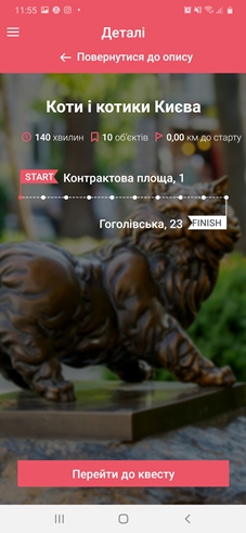 Безкоштовний мобільний додаток для тих, хто любить не тільки прогулянки, але й квести. Користувачі обирають один з маршрутів, слідують за точками на мапі, дорогою розгадують загадки та слухають цікаві історії про місця, які трапляються на шляху. Задача — відповісти правильно на всі питання та пройти квест швидше за інших учасників. Тому цей варіант не дуже підходить тим, хто полюбляє неспішні прогулянки з зупинками на горнятко кави чи перепочинок в парку, хоча гнатися за перемогою необов’язково. Щоб почати, потрібно обрати маршрут, увімкнути геолокацію, підійти на місце старту та тицьнути кнопку «Перейти до квесту». Загадки будуть на уважність, наприклад, порахувати скульптури на фасаді якогось будинку. Варто роздивлятися все навколо та помічати дрібнички, адже за кожну невірну відповідь вам нараховують штраф — додатковий час. Зараз WalQlike пропонує 10 прогулянок Києвом, серед них невеликий маршрут для родини центром столиці, квести для любителів архітектури, котиків чи містики.