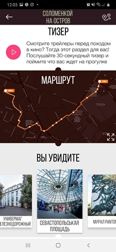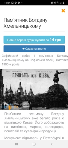 Додаток з аудіопрогулянками різними містами України та світу. Поки що доступно лише три екскурсії Києвом, дві з них платні. Так, за 75 грн можна придбати аудіогід «Демонський Київ» від Софії Грабовецької. В програмі — прогулянка Андрієвським узвозом, підйом на Замкову гору та містичні історії. 500 грн коштує екскурсія двориками в районі Золотих Воріт від Юлії Бевзенко. Цим маршрутом ви побачите скульптуру кота Пантелеймона та Їжачка в тумані, пам’ятник Ярославу Мудрому, відомий дворик з воронами та мурали. Безкоштовну екскурсію Солом’янкою пропонує науково-художня платформа «Острів». З неї ви дізнаєтесь, що називають Солом’янським ЦУМом, де варять найкраще пиво на районі та знаходиться пам’ятник Миколі Островському в образі Прометея. Цікаво може бути не лише в центрі міста.