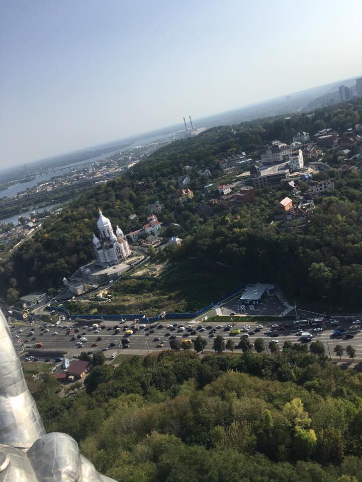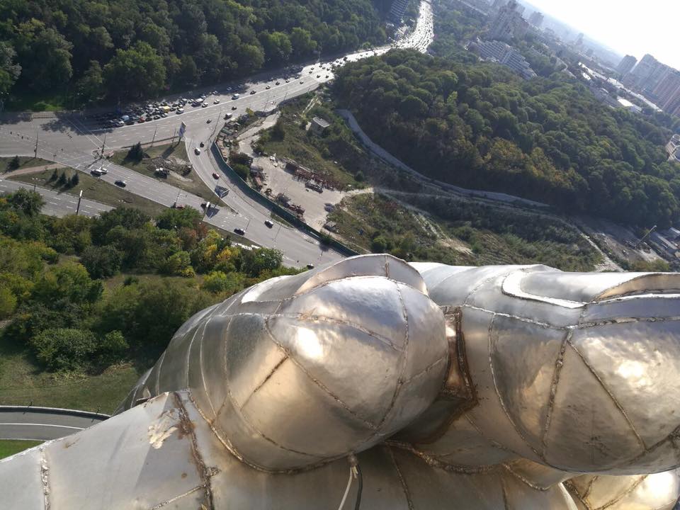Площадка находится на задней стороне щита над пальцами левой руки Родины-матери, она со всех сторон ограждена, но это не снижает уровня восторга от того, что вы наблюдаете. Отсюда видно, что правый берег Киева все еще очень зеленый, а не превращенный застройщиками в бетонную пустыню. На площадке вы проводите 10-15 минут, хотя, конечно, совсем не хочется уходить — настолько завораживающее впечатление полета, как в детских снах. За это время вы успеете нафотографироваться, повосхищаться, обсудить с инструктором традиционные киевские темы. Например, поговорите о том, что когда-то на левом берегу были только села, в центре сейчас невозможно гулять по выходным, а Киев нынче не тот, что раньше.
