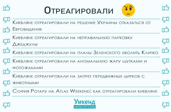 Все другие реакции, которые невозможно втиснуть в рамки удивило-возмутило-развеселило, публикуются в категории «киевляне отреагировали». Раньше киевляне реагировали на синюю руку и повышение цен на проезд, на снегопад и потепление, выступление Олега Винника на Atlas Weekend и запрет продажи спиртного по ночам. Главный фестиваль страны продолжает вызывать интерес, неизменно реагируют киевляне также на политику и погоду.