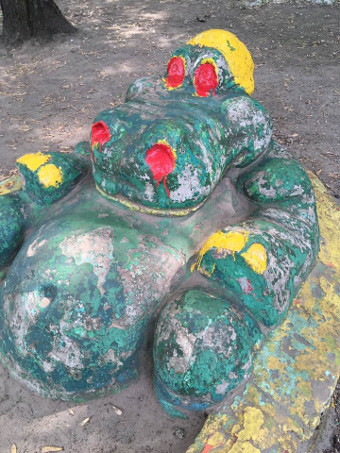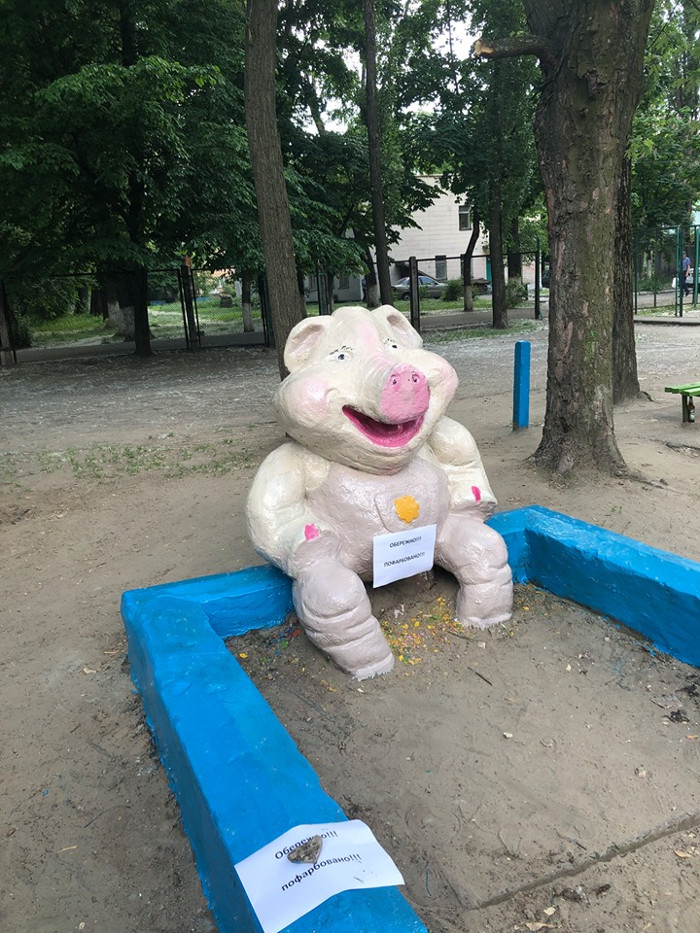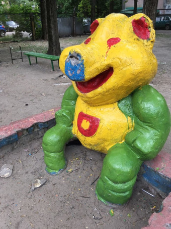 В Соломенском районе коммунальщики покрасили фигурки зверей на детской площадке. Выглядит довольно жутко, особенно «кровавые» глаза. После скандалов им придали более вменяемый вид.