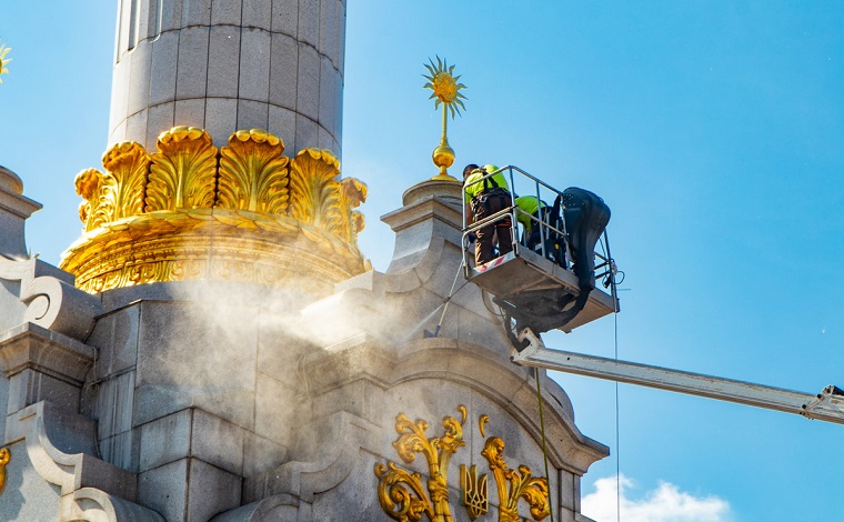 В центре города отмыли монумент независимости. Его очищали от грязи, пыли, следов птиц и надписей. Для этого привезли подъемные краны и спецтехнику. Пьедестал оттирали от грязи вручную с помощью спецсредств, которые не вредят камню, позолоченные элементы мыли чистой водой.