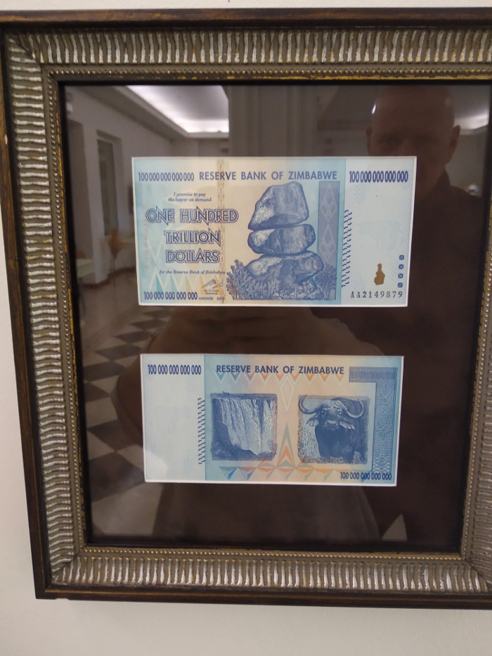 Найти в зале купюру в сто триллионов долларов определенной страны и прикинуть уровень зубожиння в этой стране.