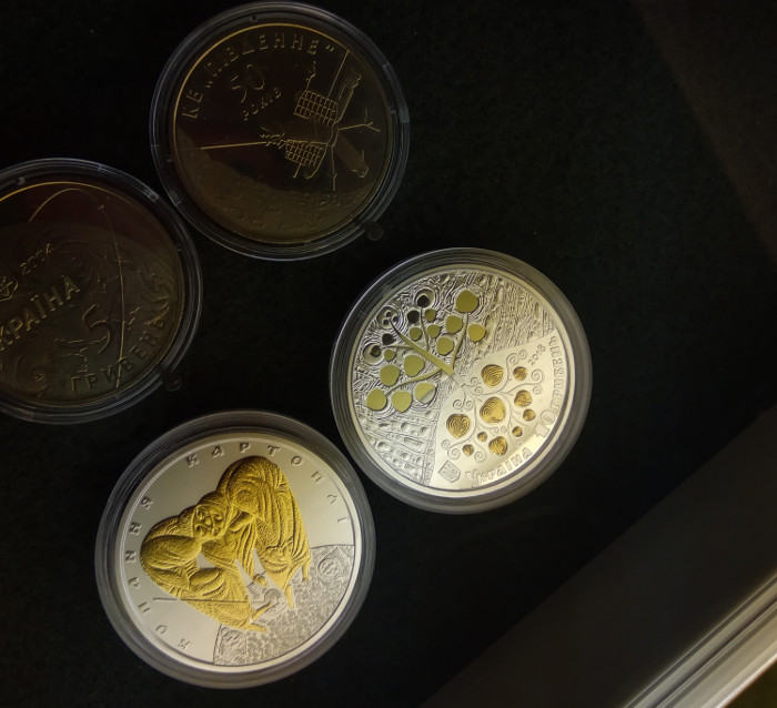 Сейчас наш Монетный двор выпускает монеты, посвященные значимым вопросам: годовщине независимости, «Энеиде», Нестору Летописцу и так далее. Выпускают и монеты с необычными сюжетами. Задачка Уикенда: найдите в музее серебряную коллекционную монету, посвященную посадке картофеля.
