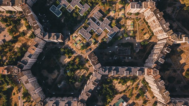 Дом по улице Заболотного, 2—122 еще называют фракталом. Он состоит из 61 дома, соединенного между собой. Особенность здания в том, что вид на него сверху очень напоминает пчелиные соты.