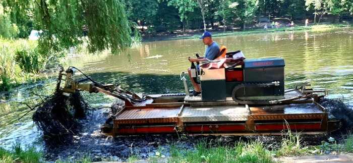 На території Голосіївського парку імені Рильського почистили озера від рослинності за допомогою машини-амфібії.