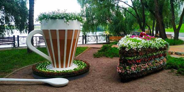 У парку «Наталка» на Оболоні зʼявився новий артобʼєкт із квітів — велика чашка кави та тістечко.