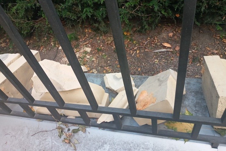 Від паркану Маріїнського палацу, який відкрили у вересні після тривалої реставрації, відвалилися шматки декору. З фотографій видно, що елементи паркану трималися на монтажній піні.