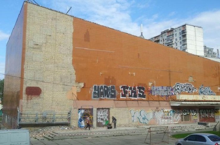 Почався ремонт фасаду кінотеатру «Братислава»: збивають стару плитку, стіни відштукатурять і пофарбують у помаранчевий колір, а потім можуть нанести візерунки. Усередині ремонт вже завершився.