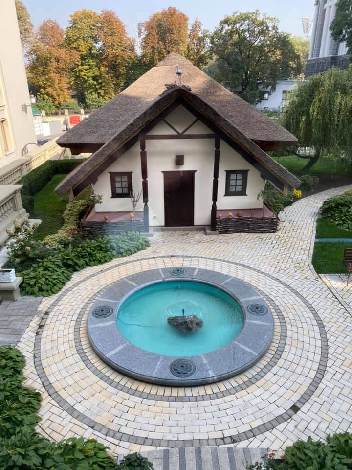 У мережі опублікували фото того, як оформлений внутрішній двір Національного банку України. Там є хатинка з огорожею та лелекою і навіть крихітне озерце.
