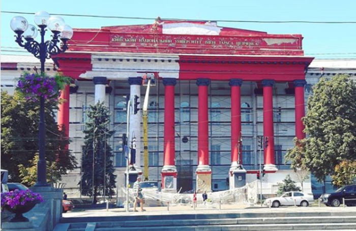 Цього тижня зʼявилися фото, на яких видно, як фасад червого корпусу університету Шевченка фарбують у білий колір. Зʼясувалося, що це фінішний шар штукатурки, його наносять для того, щоб поверхня була гладенькою та поверх неї фарба розподілялася рівномірно. Після цього корпус знову пофарбують у червоний.