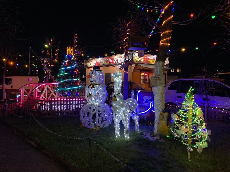 У дворі багатоповерхівки на Оболоні жителі прикрасили дерева та дитячий майданчик гірляндами і встановили фігурки, що світяться.