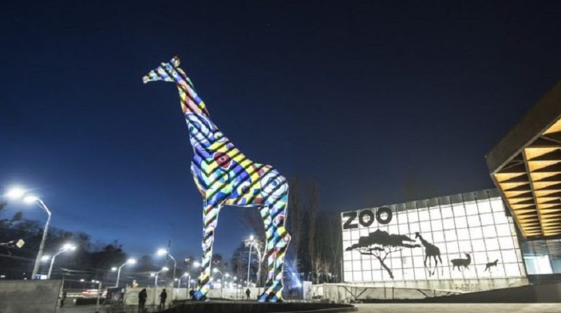 Біля зоопарку, що зараз проходить реконструкцію, тестували підсвітку фігури 15-метрового різнокольорового жирафа. Промені прожекторів направлені тільки на скульптуру, тож не сліпитимуть водіїв, що проїжджають повз, та відвідувачів. Повноцінно підсвітка запрацює після офіційного відкриття нового входу, яке заплановане на весну 2020-го.