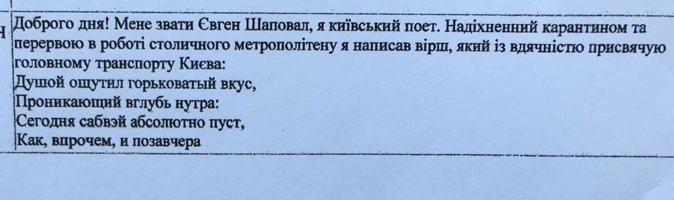 Прессекретарка метрополітену Наталка Макогон показала одне зі звернень до підземки у період карантину. Не можемо не поділитися цією римованою довершеністю.