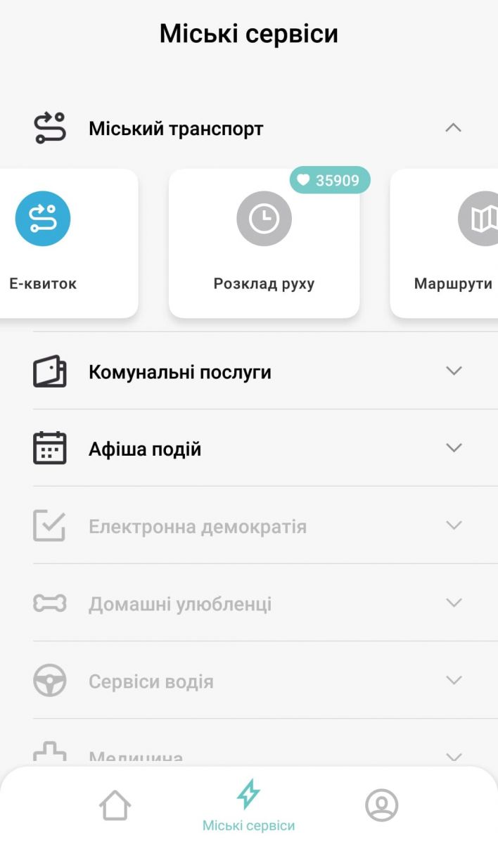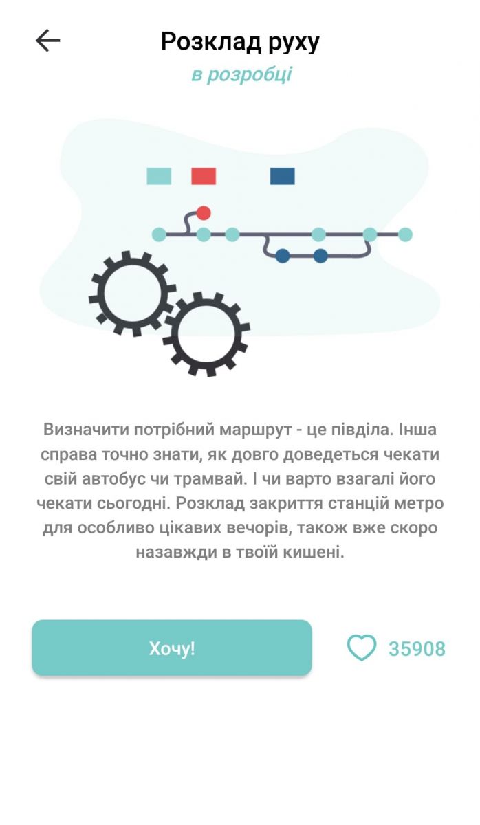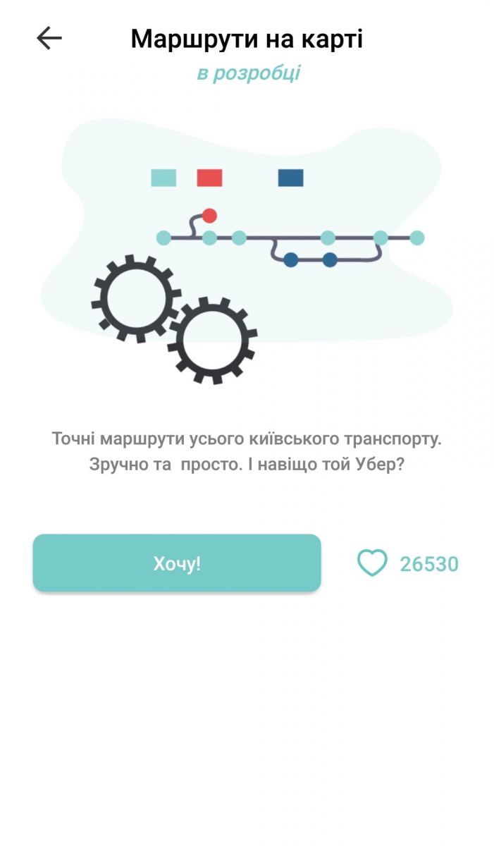 У вкладці «Міський транспорт» працює тільки опція «Е-квиток», про яку вже розповідали. У майбутньому мають відображатися розклад руху та маршрути на мапі. З усіх потенціальних можливостей кияни найбільше хочуть, аби у додатку був розклад руху транспорту — саме за нього проголосували майже 36 тисяч користувачів. На другому місці — маршрути на карті з 26 тисячами голосів. Інші опції не збирають і пʼяти тисяч «сердечок».