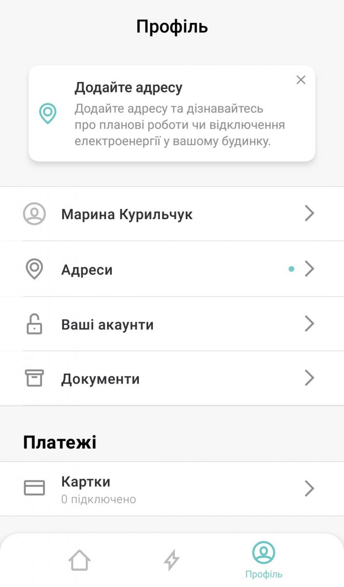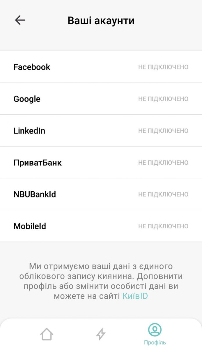 Якщо перейти у вкладку «Профіль», там можна привʼязати своє імʼя, адресу — щоб вас інформували про аварії, відключення гарячого водопостачання (про холодне нічого не скажуть) та електроенергії). Ще є варіант додати свої акаунти у фейсбуці, гуглі, лінкедіні, приватбанку. Але є одне але. Внести дані про себе у додаток неможливо — це можна зробити лише у кабінеті киянина, а вже звідти дані підтягне і додаток.
