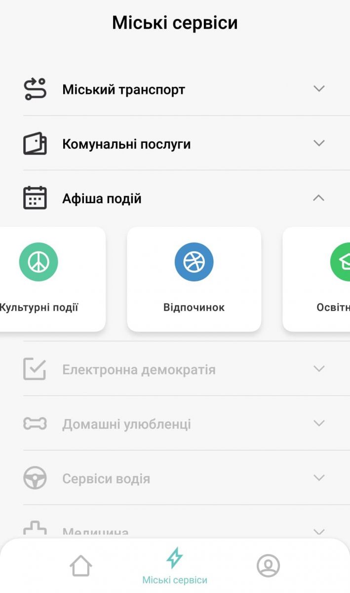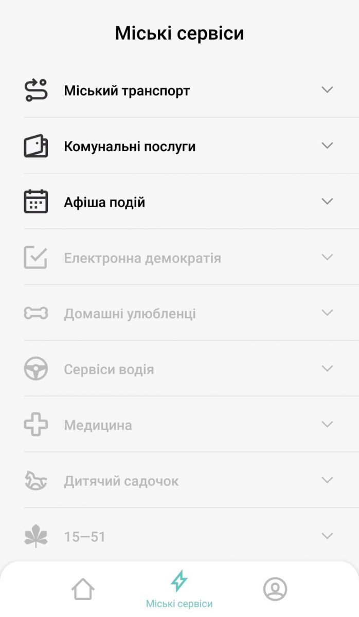 Тепер трошки про інші можливості додатку — їх небагато. Вони знаходяться у вкладці «Міські сервіси». За скріншоті ті, що чорним — мають хоч якісь опції, ті, що сірим — неактивні. Ще одна фішка додатку — можна голосувати за ті опції, які хочете, щоб ввели скоріше. Але в те, що бажаннячка спрацюють, залишається тільки вірити.