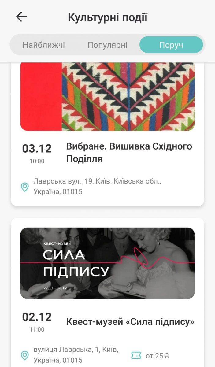 В «Афіші» можна шукати події за темою: культурні, освітні та відпочинок. А вже всередині цієї рубрикації фільтрувати за найближчими, популярними та поруч. І хоч у мене була увімкнена геолокація, події пропонувалися ті, що знаходяться в центрі міста, — хоч на той момент я знаходилась на лівому березі. Тому, здається, додаток не враховує лише те, що користувач знаходиться у Києві.