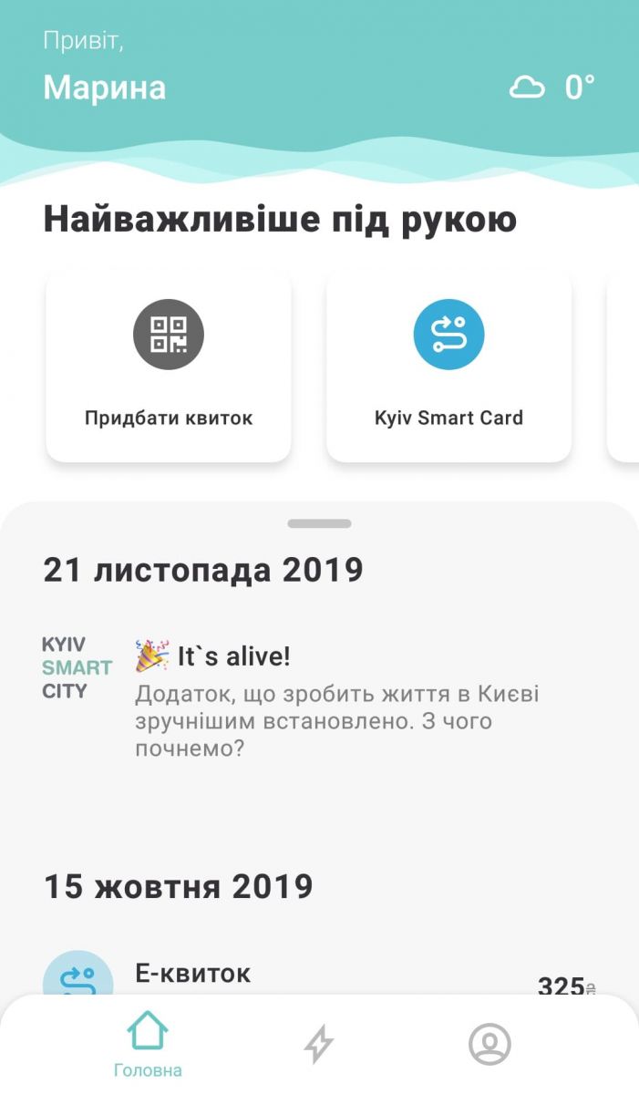 На початковому екранчику додаток вас привітає, покаже погодку, розпитає як справи запропонує придбати одноразовий квиток та переглянути свою електронну картку.