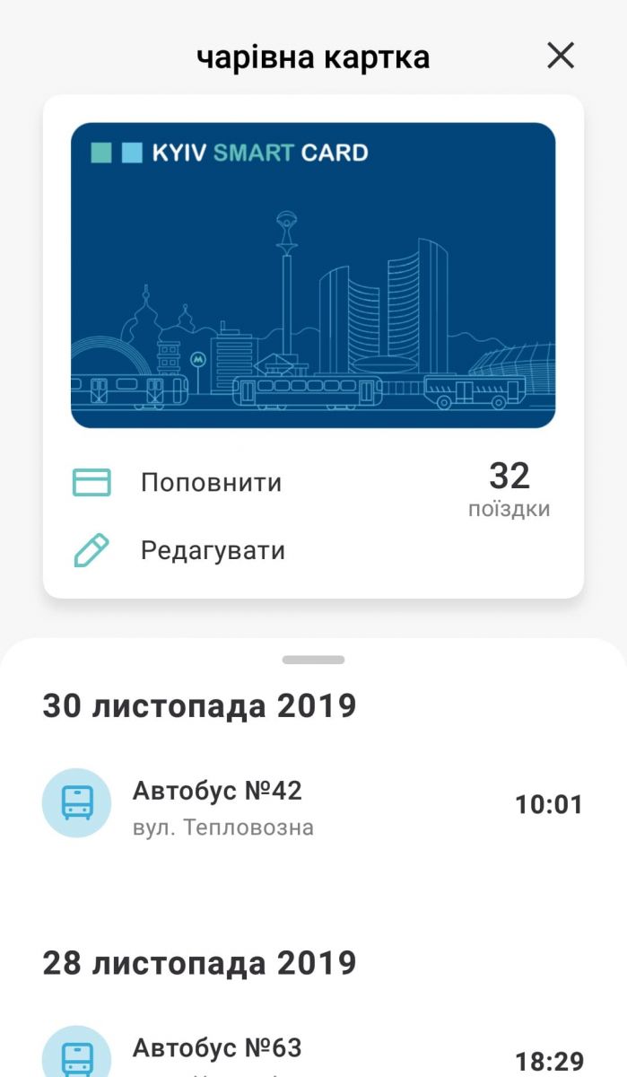 Тут можна зареєструвати свою картку. Нащо це треба? Можна подивитися, де ви сплачували за проїзд, скільки поїздок лишилося, а ще — назвати свою картку так, як вам схочеться. Я свою назвала «чарівна картка», і це можна побачити на скріншоті.