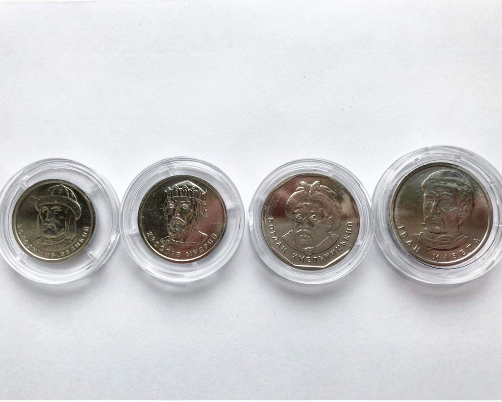 На новых монетах, которые начали чеканить в этом году, сохранили портреты тех же государственных деятелей, которые были отпечатаны на банкнотах: на гривневой будет князь Владимир Великий, на двухгривневой — князь Ярослав Мудрый, на пятерке — гетман Богдан Хмельницкий, на десятке — гетман Иван Мазепа. Как утверждают в НБУ, по цвету и размеру новые монеты будут отличаться от своих собратьев другого номинала, так что особых сложностей при расчете возникать не будет.