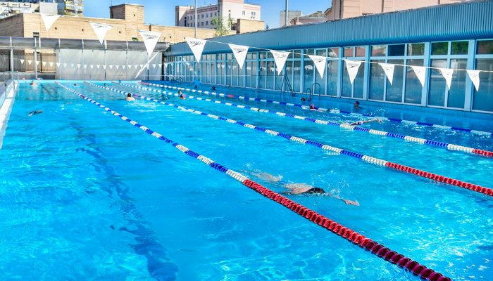 Бассейн Школы высшего спортивного мастерства с хорошим профессиональным тренерским составом и дорожками под открытым небом, которые вплоть до конца осени подогреваются до +27 градусов и не накрываются навесом.