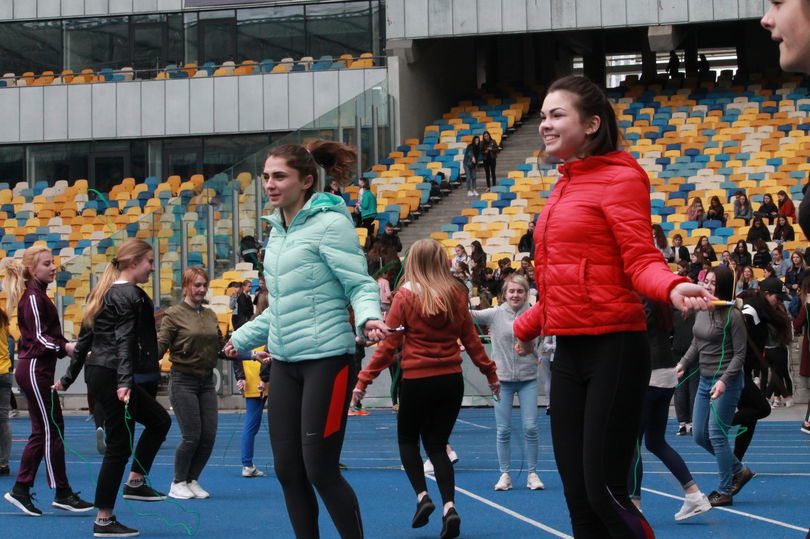 В апреле киевлянки установили рекорд по массовым прыжкам на скакалке — сразу 1832 барышни прыгали на Олимпийском. Возможно, из-за того, что организаторами выступали чиновники из разных министерств, этот рекорд получился каким-то скучным — рекорд ради рекорда. Официальная версия — девушки прыгали ради популяризации активного образа жизни среди молодежи.