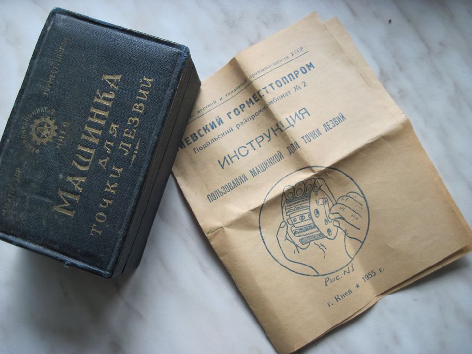 Машинка для заточування лез, випущена у 1955 році, — експонат з колекції Сергія Гриненка. На той час у місті працювали пункти для заточування лез безпечних бритв, проте випускалися і машинки для індивідуального користування. Це був досить дорогий, навіть розкішний набір. Виробляв їх Подільський райпромкомбінат №2 (не плутати з Подільским райкомбінатом №1, який випускав грамплатівки).