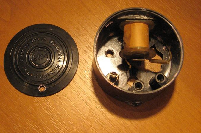 Всередині — електромагніт та «язичок». Дзвоник видає різкий противний звук. На кришечці вказаний виробник «Київський Міськмісцевпром. Завод «Механік» та значення напруги — 220 В. Оскільки дзвоник працює справно, міняти його на інший власник не збирається.