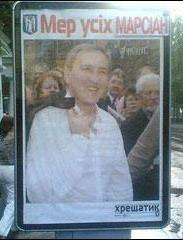 Та поки Кличко з Турчиновим боролися за лозунг, перемогу знову здобув Леонід Черновецький з гаслом Косаківського «Мер усіх киян». Щоправда, перед виборами група невідомих змінила цей лозунг на рекламних бордах Черновецького на фразу «Мер усіх марсіан».
