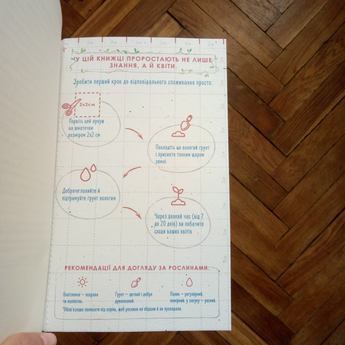У кінці є цікавий вкладиш — сторінка з біорозкладаного паперу, всередині якого — насіння. Тому читач може сам проростити рослину зі сторінки книги, дотримуючись вказівок. Так само зроблена і додаткова листівка — її можна надіслати другу, який також матиме можливість проростити її. Таке унікальне оформлення надзвичайно співзвучне до теми книги. Та й просто виглядає оригінально, бо такої «живої» книги ми ще не бачили.