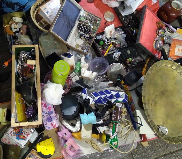 Под «первым» мостом — самая дешманская часть рынка, занятая несчастными стариками, которые выносят свои вещи из дома и знать не знают словосочетания «арендная плата». У них можно найти одежду, какие-то провода, статуэтки, посуду, ободранную бижутерию или дешевые игрушки. Чаще всего им просто нечего продавать и найти в груде хлама что-то стоящее — та еще задача.