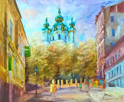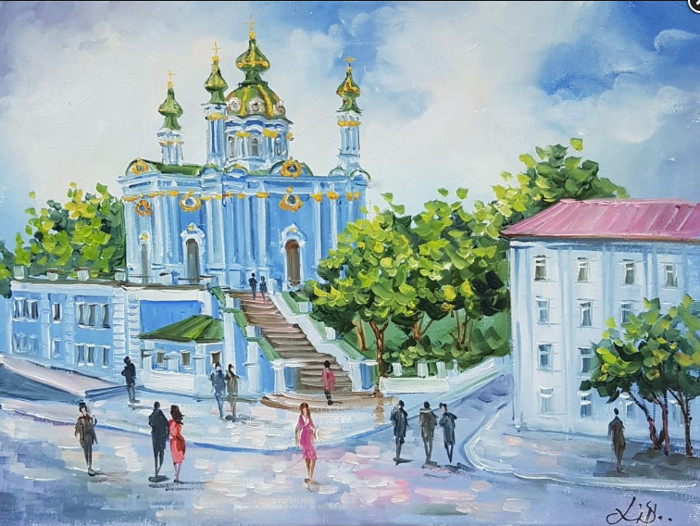 На порталі OLX пропонують на продаж аж 16 варіантів картин з Андріївською — від простенької акварелі за 360 гривень до великого полотна маслом за 12400 грн. Галерея на однойменному узвозі продає картину з церквою за 2500 гривень. Правда, робота не оформлена у рамку.
