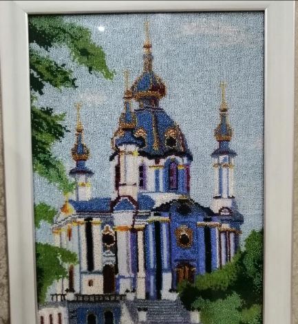 Вже вишиту бісером Андріївську церкву продають у мережі за 7000 гривень. І не думайте, що це дорого, адже тут використані якісні матеріали, встановлені спеціальне скло та рама з відомої багетної майстерні. До того ж робота виготовлялася пів року, а авторці потрібні гроші на освіту. Тому ціна цілком виправдана, запевняє вона у оголошенні.