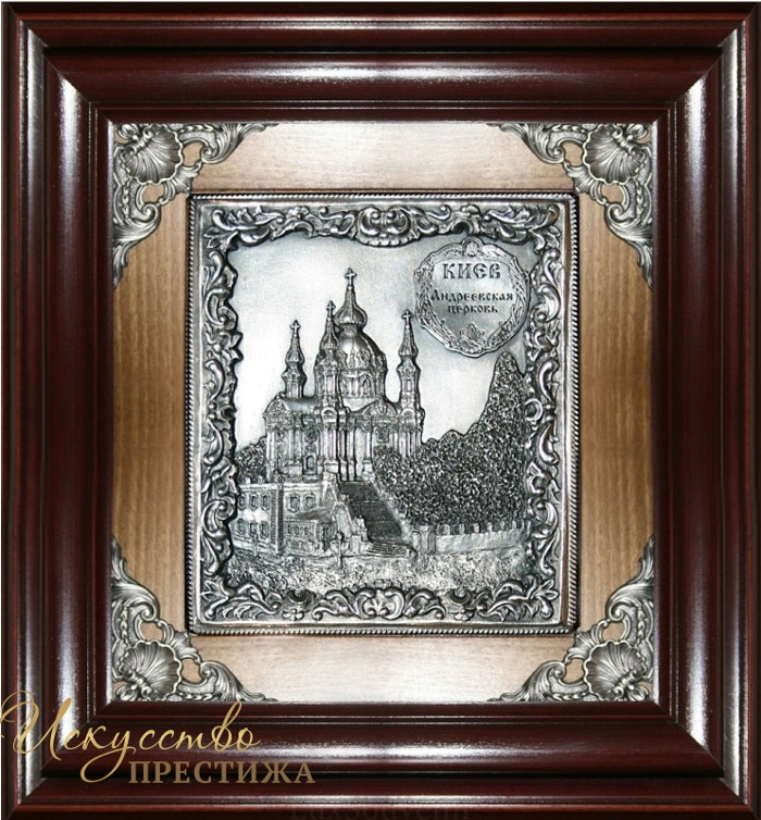 Картини є у багатьох, а вам може хочеться володіти Андріївською у незвичному виконанні? Для вибагливих існують різні варіанти. Скажімо, можна придбати металевий, багато оформлений колаж — під склом та у гарній рамці. Коштує таке мистецтво 2980 грн.