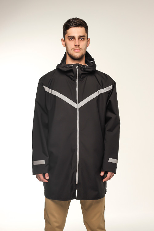Черный мужский дождевик из водонепроницаемой ткани защитит от непогоды, порадует глубоким капюшоном с фиксаторами, светоотражающими элементами и возможностью компактно сложиться в чехол.