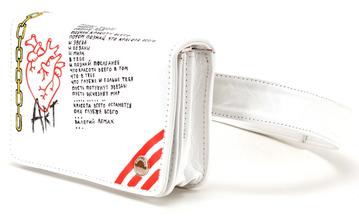 Наш особенный восторг вызвала белая поясная сумка из натуральной кожи с ручной росписью — 3300 гривен.