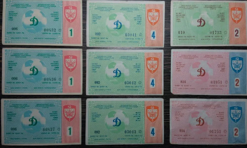 Незвичайний лот, який сподобається фанатам історії клубу, — білети речової лотереї з ігор «Динамо (Київ)» за 1987-1989 роки. Скільки всього у наборі білетів, автор не уточнює, на фото видно 9 штук. Вартість — 120 гривень.
